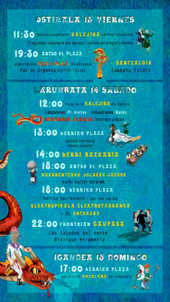Kaleetako zalapartaren ondoren, herri-bazkari goxo bat partekatzeko unea iristen da, eta, ondoren, txikienentzako jolas dibertigarriak. Eta eguzkia zerumugan ezkutatzen den bitartean, Ostatu mugikor bat kalez kale ibiltzen da, pauso bakoitzean dibertitzeko uneak eskainiz.